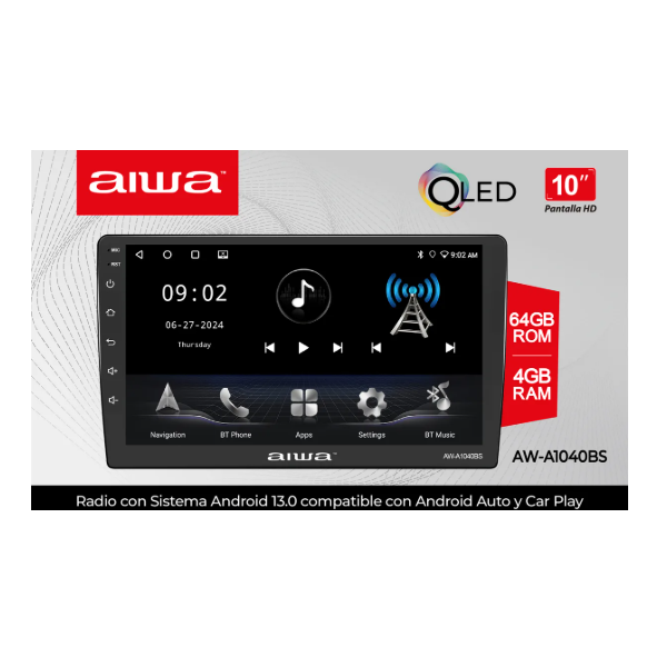 La radio AIWA AW-A1040BS te ofrece una conducción más conectada y moderna con su pantalla QLED de 10”, Android 13, conexión Android Auto/CarPlay y sonido potente de 50W x4. Rápida, fluida y perfecta para llevar tu experiencia en el auto a otro nivel.